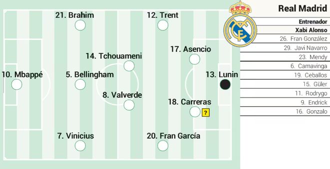 当楚阿梅尼出任本职后腰时,特伦特与弗兰·加西亚将分居左右边卫,门将由本赛季尚未出场的卢宁担任。
