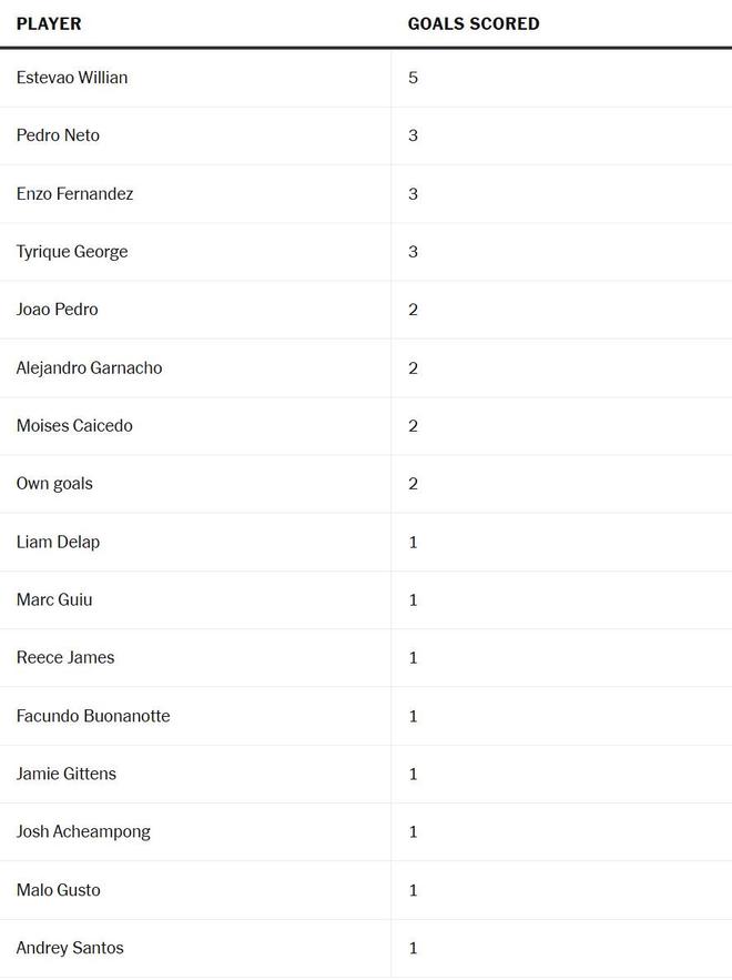 帕尔默在他迄今为止在斯坦福桥完成的两个赛季中都是切尔西的头号射手,2023-24赛季打进25球,2024-25赛季打进18球。马雷斯卡会很高兴地看到,利亚姆-德拉普对阵巴塞罗那打入第三球的利落破门,确保在帕尔默缺席的过去两个月中,已有16名不同的球员(包括乌龙球)取得过进球。他们列在下方。