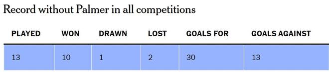帕尔默的创造力也是难以替代的,虽然助攻并不是衡量这方面能力的唯一指标,但仍然值得注意,在这同样的13场比赛中,有13名不同的球员至少贡献了一次助攻。